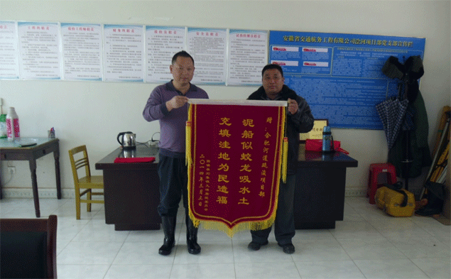 3月11日,陽光明媚,春意暖人,固鎮(zhèn)縣劉集鎮(zhèn)九灣社居委張主任代表村民送給項(xiàng)目部一面“泥船似蛟龍吸水土、充填洼地為民造?!钡腻\旗。