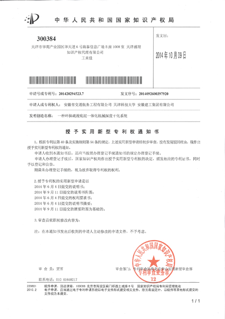 近日,國家知識(shí)產(chǎn)權(quán)總局專利管理司傳來喜訊,我公司獲得兩項(xiàng)實(shí)用新型專利授權(quán),《一種環(huán)保疏浚底泥一體化機(jī)械深度干化系統(tǒng)》,專利號(hào):201420294523.7,《一種環(huán)保疏浚余水/尾水凈化人工濕地系統(tǒng)》,專利號(hào):201420326634.1,這是公司重視“科技興企”戰(zhàn)略的重要成果,實(shí)現(xiàn)了公司在專利申請方面零的突破,同時(shí)為提高公司技術(shù)能力和深入實(shí)施“科教興企”戰(zhàn)略打下了堅(jiān)實(shí)的基礎(chǔ)。