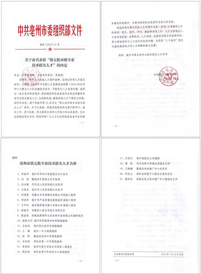 方申柱同志被授予“亳州市第五批專業(yè)技術拔尖人才”稱號