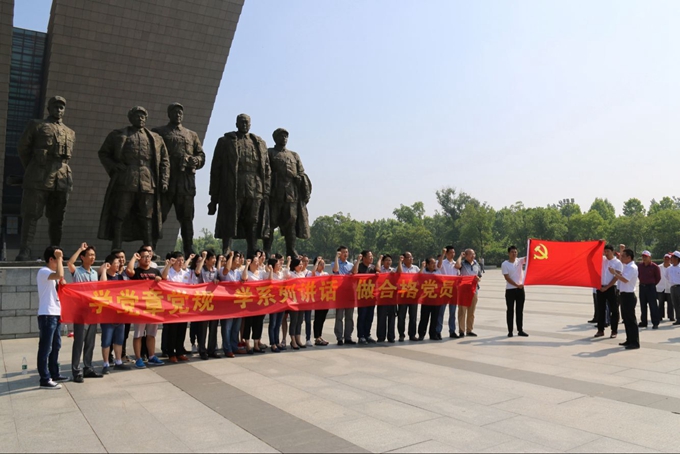 在渡江戰(zhàn)役紀(jì)念館雕像前,在機關(guān)支部委員帶領(lǐng)下,大家面對鮮紅的黨旗舉起右拳,莊嚴(yán)宣誓。