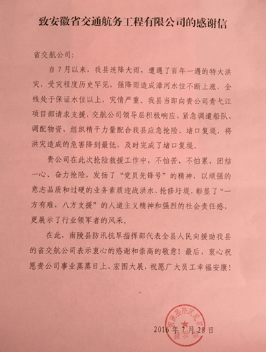 南陵縣防汛抗旱指揮部向安徽交航發(fā)來搶險救災(zāi)感謝信