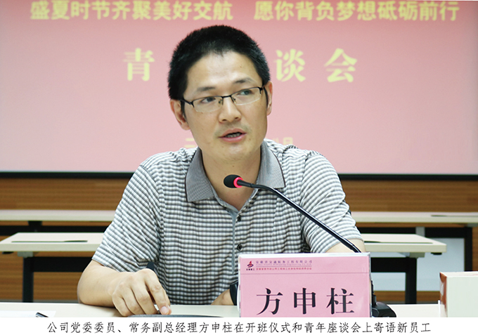 方申柱在開班儀式上作了動員講話,他號召廣大新員工要充分了解交航,自覺轉變角色;盡快融入交航,牢記崗位職責;真心熱愛交航,書寫無悔青春。方申柱結合自己畢業(yè)以來的工作、生活和學習經(jīng)歷,以一名老員工的名義語重心長地送給新員工“三個法寶”:前路漫漫,要在懈怠時做到堅持、堅持、再堅持;學無止境,要在業(yè)余時做到學習、學習、再學習;成事不易,要在工作中做到主動、主動、更主動。方申柱滿懷深情地說道:“天高任鳥飛,海闊憑魚躍。公司的未來靠大家一起去創(chuàng)造,自己的未來更要靠自己去打拼。青年朋友要立足崗位,自覺踐行‘誠信為本、敬業(yè)至上’的企業(yè)核心價值觀,弘揚‘團結、拼搏、求實、創(chuàng)新’的企業(yè)精神,發(fā)揚‘特別能吃苦,特別能戰(zhàn)斗’的企業(yè)作風,堅持腳踏實地、展示聰明才智,成就交航的偉大事業(yè)、實現(xiàn)自己的人生理想!”