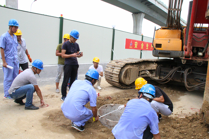 當(dāng)日上午,業(yè)主代表及第三方單位一行人到場(chǎng)檢查指導(dǎo)安徽交航公司承建的潛口路站首根樁基成孔工作。項(xiàng)目測(cè)量組對(duì)首根樁位進(jìn)行精確放樣,并對(duì)鉆機(jī)鉆桿進(jìn)行垂直度矯正。9點(diǎn)28分,鉆機(jī)啟動(dòng),在項(xiàng)目各部門有序配合下。歷時(shí)1小時(shí)20分鐘順利成孔。