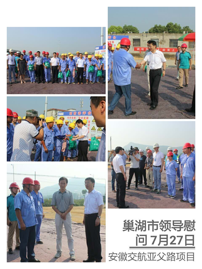 2017年7月27日上午,巢湖市市委副書記、市長張生在巢湖市總工會、重點局主要領(lǐng)導(dǎo)的陪同下,冒著酷暑來到我公司亞父路項目部施工現(xiàn)場檢查慰問,為大家送來了夏季防暑降溫用品。