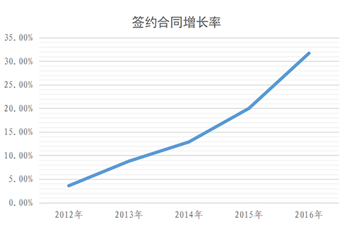 從經(jīng)營(yíng)指標(biāo)完成情況來(lái)看,五年間(2012~2016年),在集團(tuán)公司的正確領(lǐng)導(dǎo)下,安徽交航每年都能超額完成集團(tuán)下達(dá)的經(jīng)營(yíng)任務(wù),新簽合同額逐年遞增,增長(zhǎng)率呈上升趨勢(shì),發(fā)展態(tài)勢(shì)良好。