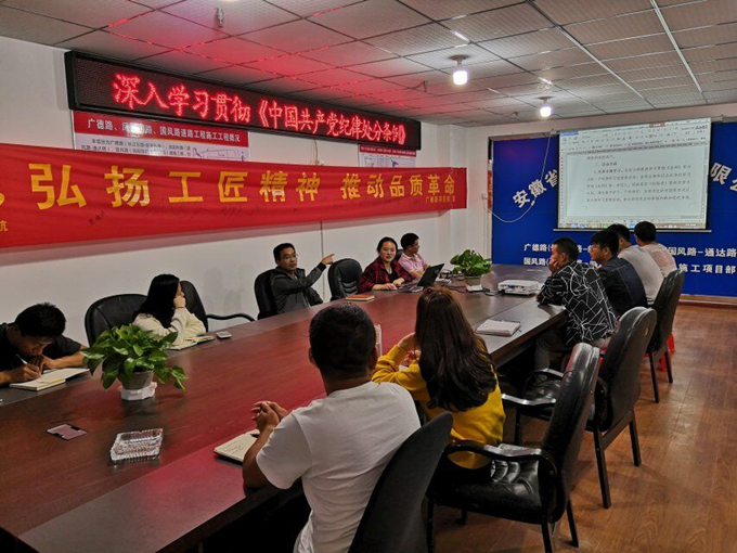 10月9日,廣德路項目部積極響應上級要求,召開了黨支部擴大會議,組織項目部全體職工認真學習新修訂的《中國共產黨紀律處分條例》。