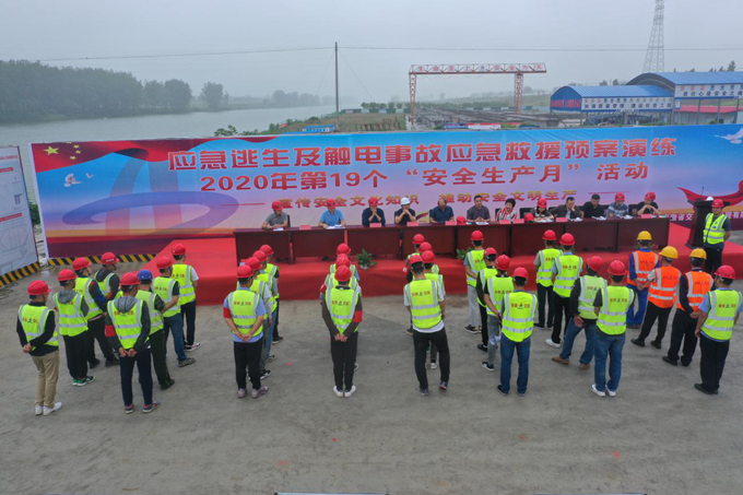 針對工地有可能發(fā)生的安全事故,此次安全演練共有應急逃生急救與觸電急救兩方面內容,演練的主要內容有圍堰基坑涌水逃生,以及觸電、傷員急救。項目部從方案制定、人員安排、器材準備、現(xiàn)場管理等方面出發(fā),項目部以及各施工班組均派遣管理人員和工人參與演練,并邀請利辛縣交通局、海事局、水利局、項目公司、監(jiān)理單位前來觀摩。此次應急演練取得圓滿成功,得到現(xiàn)場觀摩單位的一致好評。