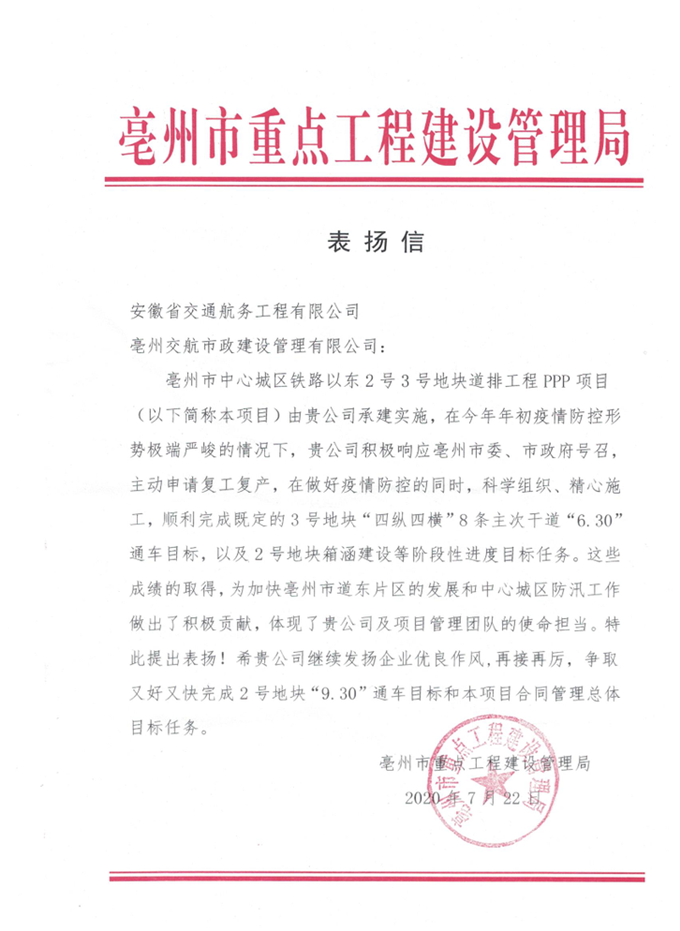 信中高度表揚(yáng)了在今年年初疫情防控形勢極端嚴(yán)峻的情況下,安徽交航公司積極響應(yīng)亳州市委、市政府的號召,主動(dòng)申請復(fù)工復(fù)產(chǎn),在做好疫情防控的同時(shí),科學(xué)組織、精心施工,順利完成了既定的3號地塊“四縱四橫”8條主干道“6.30”通車目標(biāo),以及2號地塊箱涵建設(shè)等階段性的進(jìn)度目標(biāo)任務(wù),充分彰顯了國企的使命與擔(dān)當(dāng)。同時(shí),信中希望安徽交航公司繼續(xù)發(fā)揚(yáng)企業(yè)優(yōu)良作風(fēng),再接再厲,爭取又好又快的完成2號地塊“9.30”通車目標(biāo)和本項(xiàng)目合同管理總體目標(biāo)任務(wù)。
