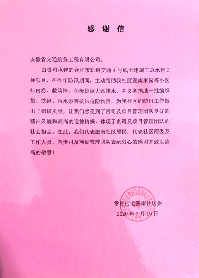 7月28日早上,安徽交航合軌4號線TJ03標(biāo)項(xiàng)目部收到一封來自駐地社居委送來的感謝信,對項(xiàng)目部主動幫助社區(qū)排內(nèi)澇、救險(xiǎn)情以及義務(wù)捐助防汛物資的志愿服務(wù)行動給予了高度贊揚(yáng),并表達(dá)了由衷感謝。