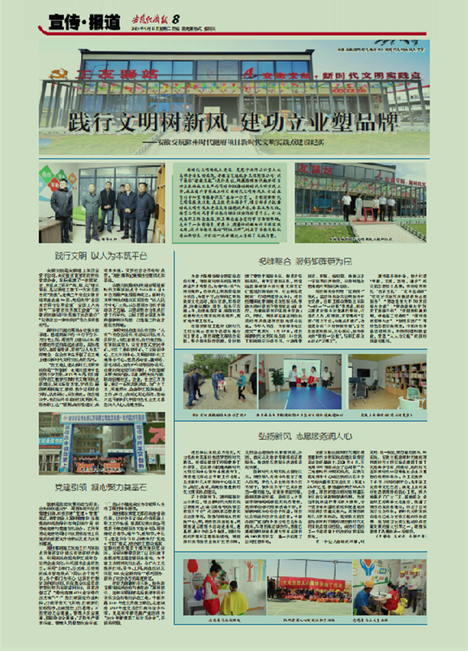 與此同時(shí),公司還積極向集團(tuán)及省級主流媒體推報(bào)公司防汛救災(zāi)復(fù)重建、堅(jiān)持高質(zhì)量發(fā)展以及“十四五”規(guī)劃編制等經(jīng)驗(yàn)做法,深入宣傳公司內(nèi)在學(xué)習(xí)宣傳貫徹工作中涌現(xiàn)出的先進(jìn)典型,不斷把學(xué)習(xí)宣傳工作引向深入。在今年防汛抗洪救災(zāi)中,公司的防汛救災(zāi)工作被省級主流媒體中安在線深入報(bào)道,徐鑫、田龍和沈宏三位同志被評為“最美志愿者”并在公司網(wǎng)上刊發(fā)了他們先進(jìn)抗洪事跡。大力實(shí)施基層黨建“領(lǐng)航”計(jì)劃,《安徽經(jīng)濟(jì)報(bào)》于9月15日對公司滁州時(shí)代樾府項(xiàng)目新時(shí)代文明點(diǎn)典型經(jīng)驗(yàn)做法,用了整版進(jìn)行專題報(bào)道。
