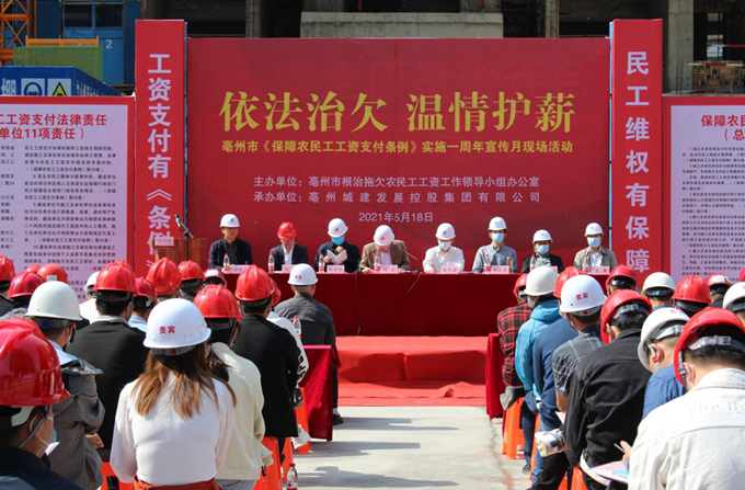 5月18日上午,亳州市《保障農(nóng)民工工資支付條例》實(shí)施一周年宣傳月現(xiàn)場活動(dòng)在亳州建工承建的建投東方名府云著項(xiàng)目舉行。市政府副秘書長劉巖出席活動(dòng)并致辭,市委宣傳部、市人社局、市住建局、市交通局、市水利局、城建集團(tuán)以及亳州建工等單位有關(guān)人員參加活動(dòng)。