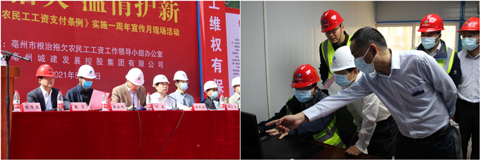 活動(dòng)結(jié)束后,亳州建工總經(jīng)理劉軍陪同市人社局局長陳長安對(duì)東方名府云著項(xiàng)目的日常勞資工作進(jìn)行了檢查指導(dǎo),并督促新系統(tǒng)盡快落實(shí)。