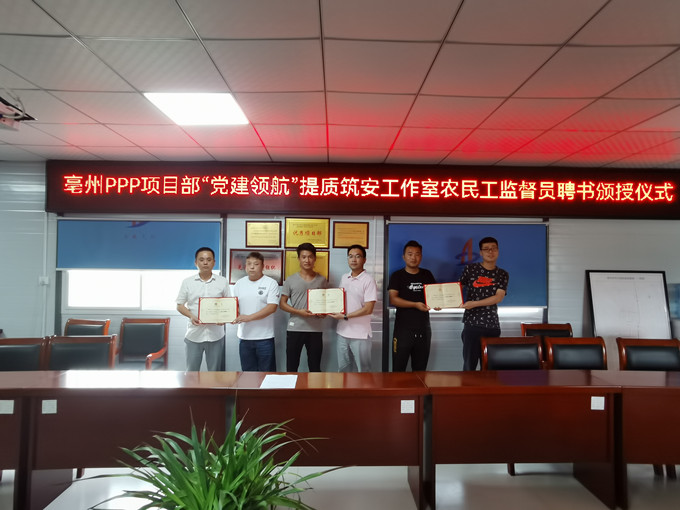 為推動公司新時代文明實踐點“黨建領(lǐng)航”提質(zhì)筑安工作走深走實,日前,亳州PPP項目新時代文明實踐點舉行農(nóng)民工監(jiān)督員聘任儀式。經(jīng)過前期推薦、審核、考察、公示等一些列環(huán)節(jié),最終有3名農(nóng)民工符合規(guī)定要求,正式被聘任為農(nóng)民工監(jiān)督員。