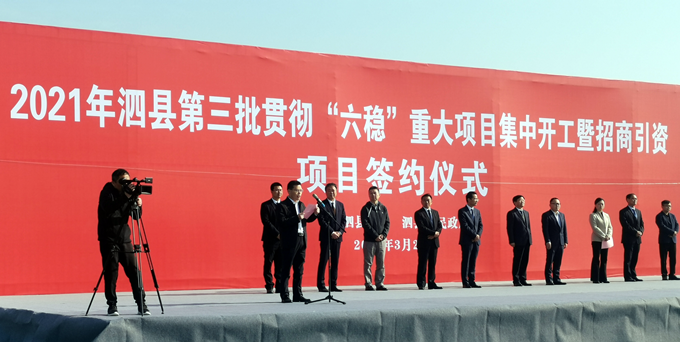 3月26日上午,由泗縣2021年第三批貫徹“六穩(wěn)”重大項目集中開工暨招商引資項目簽約儀式在安徽交航參建的泗縣長三角綠色農產品加工物流產業(yè)園施工現場舉行。宿州市市委常委、泗縣縣委書記張志強,宿州市政協(xié)副主席、泗縣縣委副書記、縣長王法立,縣委副書記王汝娜及泗縣農業(yè)農村局等領導出席開工儀式。公司財務總監(jiān)高偉應邀出席,并與泗縣主要領導共同為項目奠基。