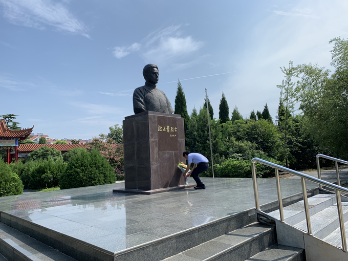 其后,曹萬(wàn)飛等人代表大家向江上青烈士紀(jì)念碑與彭雪楓烈士紀(jì)念碑敬獻(xiàn)鮮花,全體人員在紀(jì)念碑前深深鞠躬,集體默哀3分鐘。最后,全體黨員高舉右拳,莊嚴(yán)宣誓,重溫了入黨誓詞,面對(duì)黨旗再一次做出自己的莊嚴(yán)承諾。