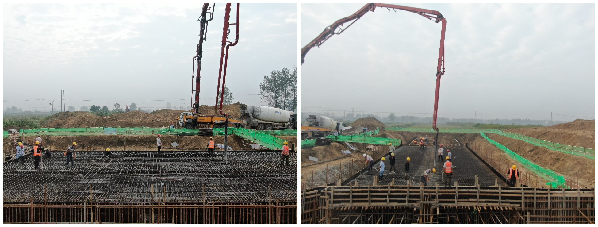 自儀式啟動(dòng)以來,為快速掀起大干快干熱潮,確保年底完成既定進(jìn)度產(chǎn)值,泗縣長三角產(chǎn)業(yè)園項(xiàng)目緊緊圍繞項(xiàng)目年度生產(chǎn)任務(wù),秉持“工期就是效益”的理念,主動(dòng)對標(biāo)長三角一體化發(fā)展城鄉(xiāng)建設(shè)示范性勞動(dòng)和技能競賽,充分發(fā)揮主人翁精神和主力軍作用,確保項(xiàng)目工期、產(chǎn)值等各項(xiàng)任務(wù)圓滿實(shí)現(xiàn)。今年9月9日,在炎熱高溫天氣下,泗縣長三角產(chǎn)業(yè)園項(xiàng)目龍河路箱涵,在超長雨季間歇期完成的底板混凝土澆筑、頂板及側(cè)墻鋼筋綁扎、模板支設(shè),經(jīng)過監(jiān)理單位驗(yàn)收合格,終于迎來了頂板及側(cè)墻混凝土的澆筑。由于混凝土澆筑方量大,項(xiàng)目部提前向商混站報(bào)備所需泵車、混凝土標(biāo)號、方量,預(yù)計(jì)澆筑時(shí)間等計(jì)劃。9日清晨6點(diǎn)鐘,項(xiàng)目部技術(shù)管理人員到達(dá)磅房和施工位置,指揮泵車過磅,安排工人測溫及班前培訓(xùn)。在施工過程中,項(xiàng)目部技術(shù)管理人員時(shí)刻與工人一起,送藥送水,極大地鼓舞了廣大工人的生產(chǎn)熱情,經(jīng)過八個(gè)小時(shí)連續(xù)奮戰(zhàn),澆筑任務(wù)圓滿完成。
