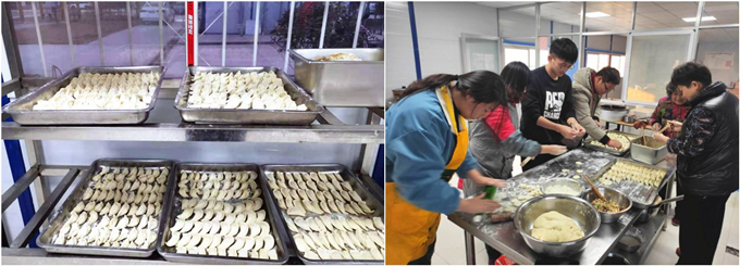 活動現(xiàn)場,食堂大廚事先將準備好的餡料擺上桌臺,大家圍成一桌,有的負責揪面團、有的負責搟餃子皮、有的負責包餃子,相互間配合默契,分工明確。大家一邊包餃子一邊聊著天,分享著各自家鄉(xiāng)的風土人情和飲食習慣,暢想著未來的美好生活,每個人的臉上都洋溢著幸福感。很快,一個個獨具地方特色和個性的餃子就包好了,從中體會到的歡樂、合作、友誼、鄉(xiāng)愁相互雜糅,頓感莫名的溫馨和幸福。