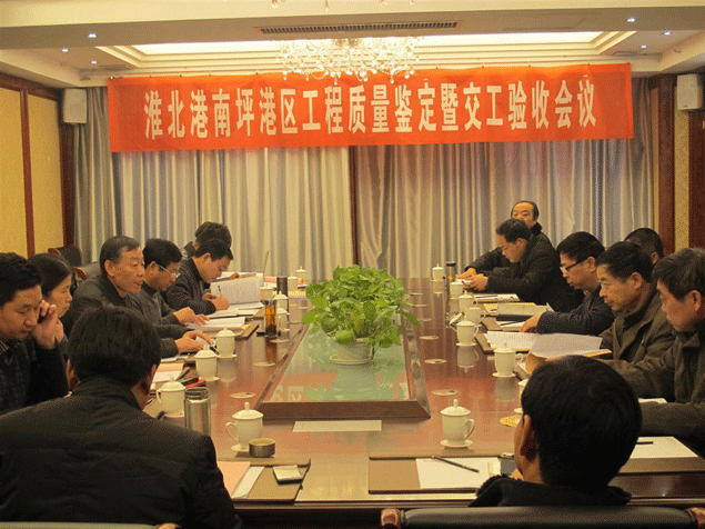 2013年12月31日,由交航公司承建的淮北港南坪港區(qū)工程交工質(zhì)量鑒定會(huì)議在淮北召開,會(huì)議有安徽省交通質(zhì)監(jiān)局組織主持;安徽省交通質(zhì)監(jiān)局副局長(zhǎng)馬中南、水管處處長(zhǎng)周基群,安徽港投集團(tuán)副總王燦、總助高勝,項(xiàng)目辦主任汪能文,交航公司副總侯力、工程部經(jīng)理李立柱及請(qǐng)聘專家等參加了會(huì)議。