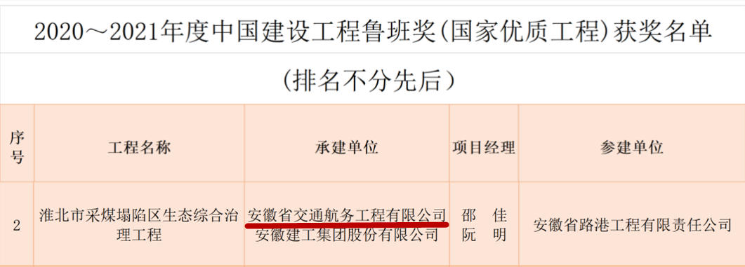 近日,中國建筑業(yè)協(xié)會公布了2020~2021年度中國建設(shè)工程魯班獎(國家優(yōu)質(zhì)工程)名單,安徽交航承建的淮北市采煤塌陷區(qū)生態(tài)綜合治理工程榮登榜單,獲評中國建設(shè)工程最高獎項——魯班獎。