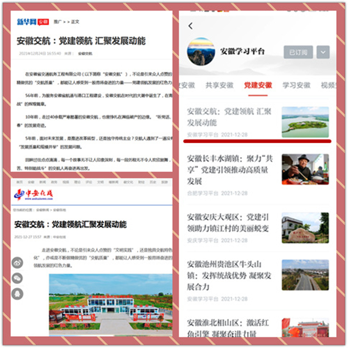 近日,新華社(新華網(wǎng))、學(xué)習(xí)強(qiáng)國、中安在線等中央及省級主流媒體,紛紛聚焦安徽交航黨建工作,集中報(bào)道了十九大以來安徽交航深入學(xué)習(xí)貫徹習(xí)近平新時(shí)代中國特色社會主義思想,堅(jiān)持和加強(qiáng)黨的領(lǐng)導(dǎo),推進(jìn)全面從嚴(yán)治黨及以黨建領(lǐng)航高質(zhì)量發(fā)展等方面取得的一系列成果。