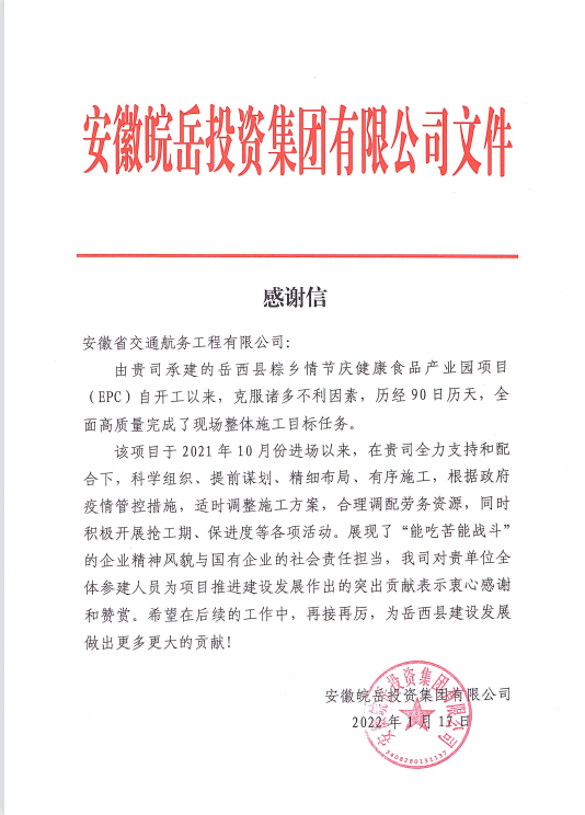 日前,公司收到業(yè)主方皖岳集團感謝信,對公司岳西縣粽鄉(xiāng)情節(jié)慶健康食品產(chǎn)業(yè)園項目部全體參建人員為推進項目建設作出的突出貢獻表示衷心感謝。