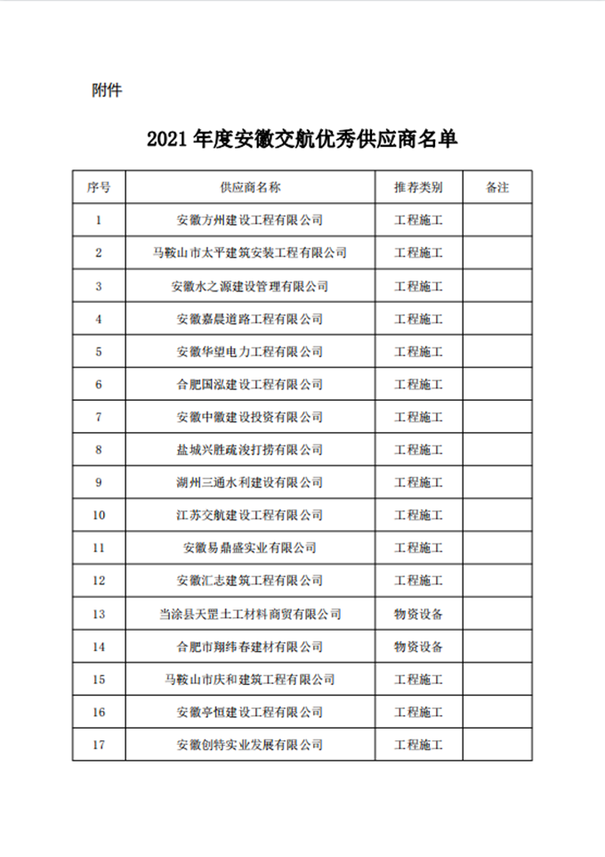 為進(jìn)一步規(guī)范公司供應(yīng)商管理,提高供應(yīng)商履約意識(shí),促進(jìn)建立長(zhǎng)期穩(wěn)定的供應(yīng)商合作關(guān)系,根據(jù)《安徽建工集團(tuán)股份有限公司供應(yīng)商管理辦法》、《安徽省交通航務(wù)工程有限公司供應(yīng)商管理辦法》等有關(guān)規(guī)定,經(jīng)所屬單位按照優(yōu)秀供應(yīng)商入庫(kù)條件并考核推薦,公司審核并報(bào)總辦會(huì)審議通過。現(xiàn)公布2021年度公司優(yōu)秀供應(yīng)商名單。