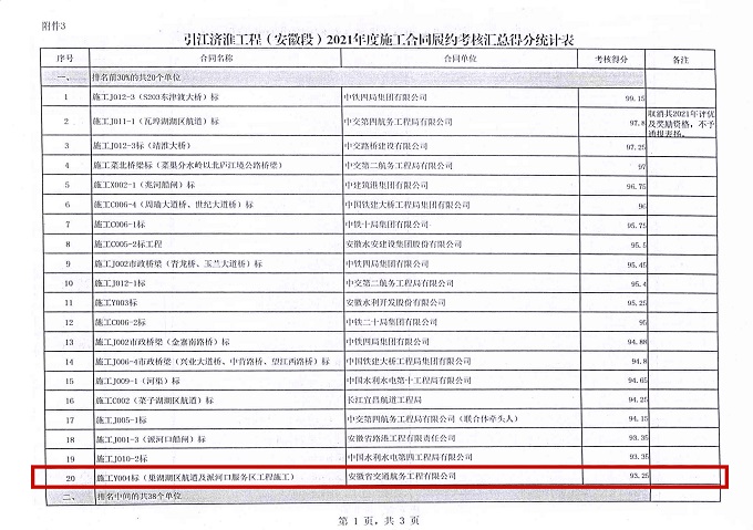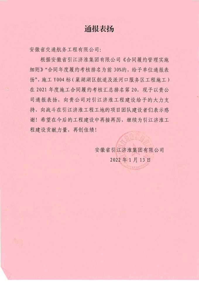 日前,安徽交航公司承建的引江濟淮工程(安徽段)巢湖湖區(qū)航道及派河口服務(wù)區(qū)工程,在2021年度施工合同履約考核匯總排名中位列前30%,受到業(yè)主單位省引江濟淮集團通報表揚。