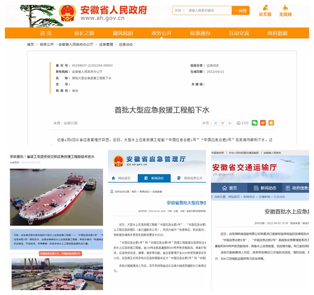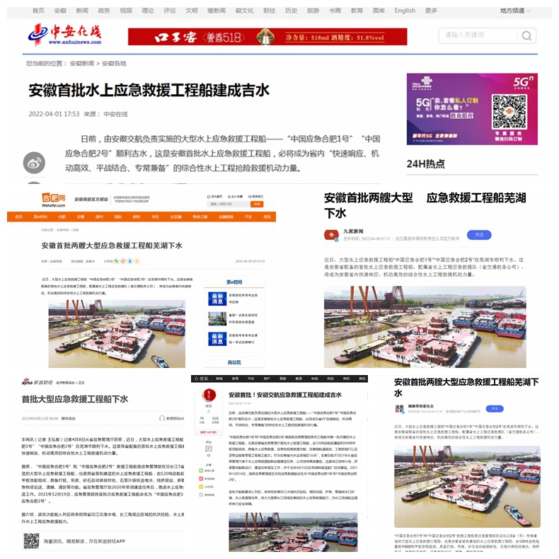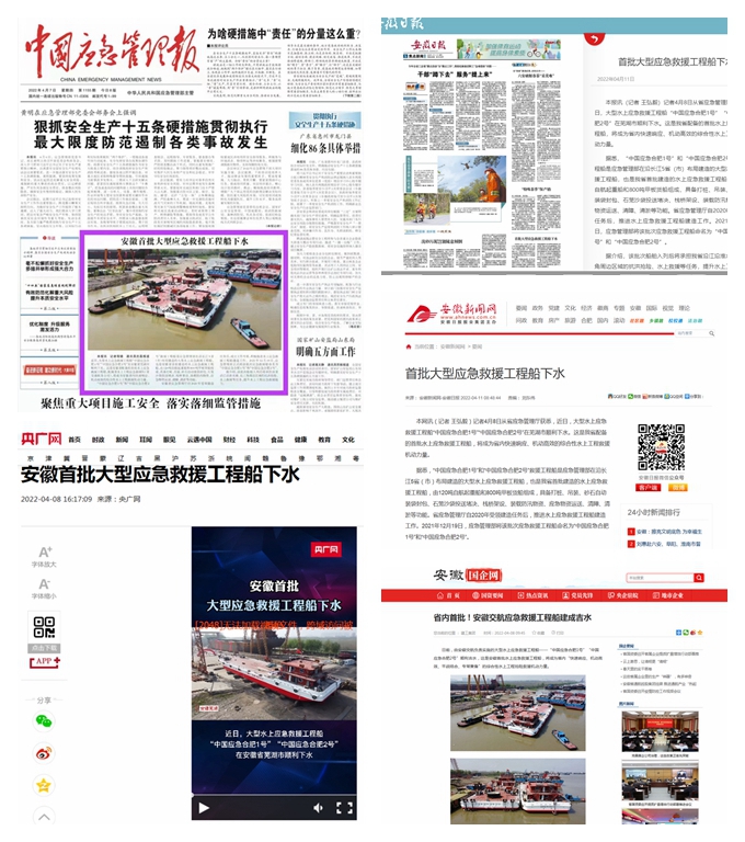 日前,由安徽交航負(fù)責(zé)實(shí)施的省內(nèi)首批大型水上應(yīng)急救援工程船——“中國應(yīng)急合肥1號(hào)”“中國應(yīng)急合肥2號(hào)”順利建成吉水,這一重要消息通過安徽省國資委、中安在線發(fā)布后,立即引發(fā)社會(huì)廣泛關(guān)注,獲中國應(yīng)急報(bào)、央廣網(wǎng)、安徽日?qǐng)?bào)、安徽商報(bào)、瀟湘晨報(bào)等主流媒體以及安徽國企網(wǎng)、安徽新聞網(wǎng)、九派新聞、騰訊網(wǎng)、新浪網(wǎng)以及搜狐網(wǎng)等多家國內(nèi)知名新聞網(wǎng)站集中報(bào)道,其中安徽省人民政府、安徽省交通運(yùn)輸廳、安徽省應(yīng)急管理廳等政府網(wǎng)站紛紛進(jìn)行了轉(zhuǎn)載。