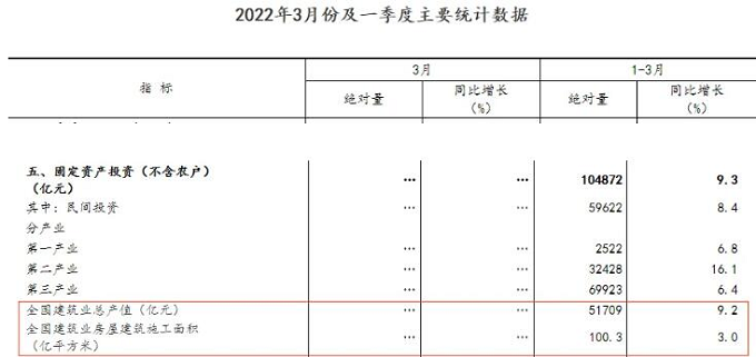 據(jù)統(tǒng)計,1-3月,全國建筑業(yè)總產(chǎn)值51709億元,同比增長9.2%;全國建筑業(yè)房屋建筑施工面積100.3億平方米,同比增長3.0%。