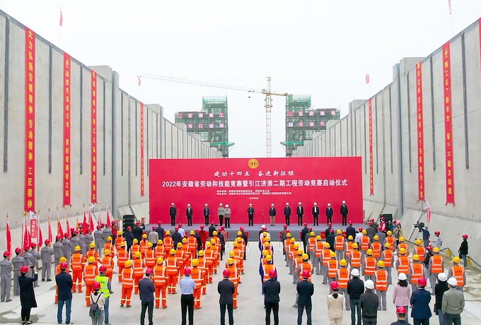 5月11日上午,由安徽省勞動競賽委員會、安徽省總工會主辦,安徽建工集團控股有限公司、安徽省引江濟淮集團有限公司承辦的2022年安徽省勞動和技能競賽暨引江濟淮二期工程勞動競賽啟動儀式在安徽省路港工程有限責任公司承建的引江濟淮工程派河口船閘項目現場舉行。