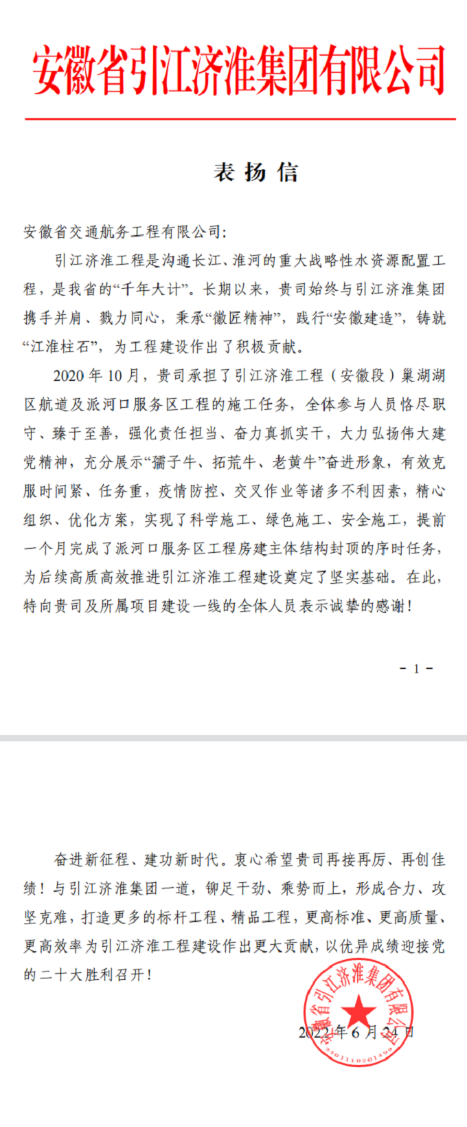 近日,安徽交航收到安徽省引江濟淮集團有限公司發(fā)來的表揚信,對安徽交航引江濟淮工程(安徽段)巢湖區(qū)航道及派河口服務(wù)區(qū)工程項目在項目管理、工程進度、疫情防控、安全文明施工等方面的優(yōu)異表現(xiàn)予以表揚和感謝。