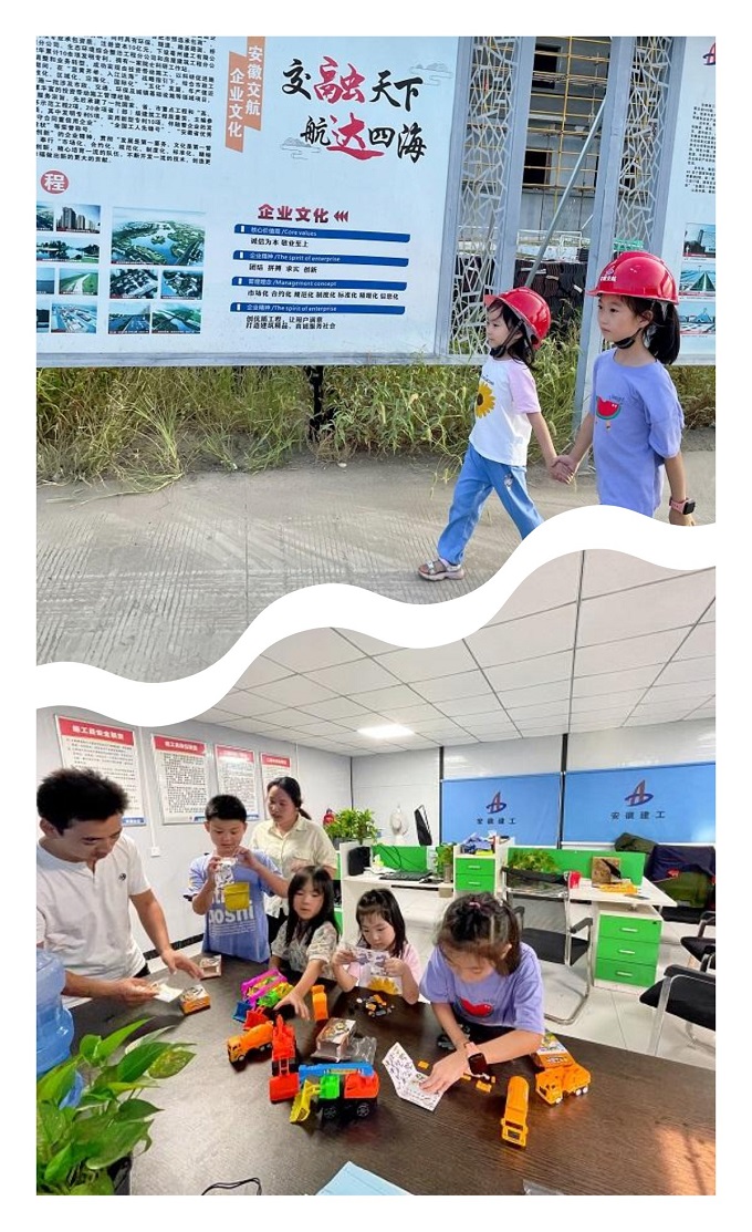 本次活動以“交流話夢想”形式拉開序幕,小朋友們收到了項(xiàng)目部精心準(zhǔn)備的“小候鳥”學(xué)習(xí)用品禮包,在自我介紹中暢享未來許下“童心愿望”,在益智活動中動手拼裝工程車輛模型,享受親情溫暖、收獲友情歡樂。活動不僅讓孩子們玩得盡興,更將寓教于樂進(jìn)行到底。在父母的帶領(lǐng)下,孩子們迎來工地“初體驗(yàn)”,孩子們帶上安全帽,參觀項(xiàng)目參觀了辦公區(qū)、生活區(qū)以及施工現(xiàn)場,學(xué)習(xí)項(xiàng)目建設(shè)的知識和安全常識,陪爸爸媽媽吃一頓工作餐,“零距離”體驗(yàn)父母的日常工作、生活的環(huán)境,體會父母工作的艱辛和不易。