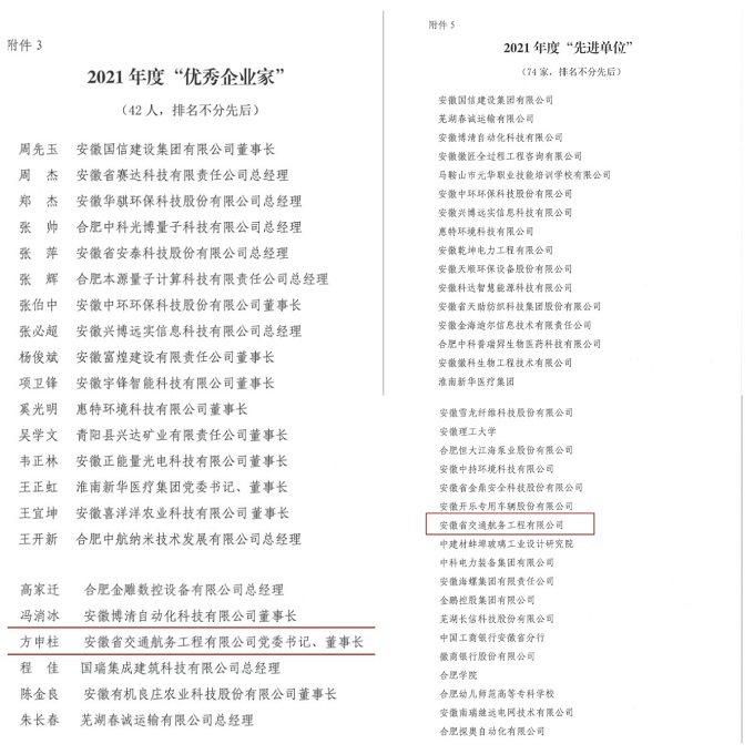 安徽交航公司喜獲兩項(xiàng)榮譽(yù)獎(jiǎng)項(xiàng),安徽交航公司喜獲2021年度“先進(jìn)單位”榮譽(yù)獎(jiǎng)項(xiàng),公司黨委書(shū)記、董事長(zhǎng)方申柱榮獲2021年度“優(yōu)秀企業(yè)家”榮譽(yù)獎(jiǎng)項(xiàng)。方申柱作為獲獎(jiǎng)代表發(fā)言,發(fā)言中他簡(jiǎn)要介紹了安徽交航公司和安徽生態(tài)科技公司運(yùn)營(yíng)情況,他表示將加強(qiáng)同科學(xué)家企業(yè)家協(xié)會(huì)的聯(lián)系,希望協(xié)會(huì)協(xié)會(huì)提供更多針對(duì)性服務(wù),在技術(shù)上給予更大支持,發(fā)揮院士、專(zhuān)家、學(xué)者等幫助企業(yè)技術(shù)創(chuàng)新的作用。