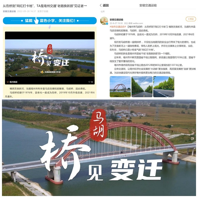 近日,安徽交通運(yùn)輸廳微博和公眾號(hào)分別轉(zhuǎn)發(fā)亳州晚報(bào)對(duì)安徽交航公司改建利辛縣馬胡橋?qū)n}報(bào)道。馬胡橋改建工程于2019年10月18日開工建設(shè),2021年6月8日完成交工驗(yàn)收。在安徽交航公司的雕琢之下,馬胡橋從一座年久失修、無人問津的危橋華麗轉(zhuǎn)身當(dāng)?shù)亍熬W(wǎng)紅打卡地”,老橋換新顏,不僅成為居民出行的高效通道,也成為茨淮新河的一道獨(dú)特風(fēng)景,有效增強(qiáng)了居民群眾的獲得感、幸福感。