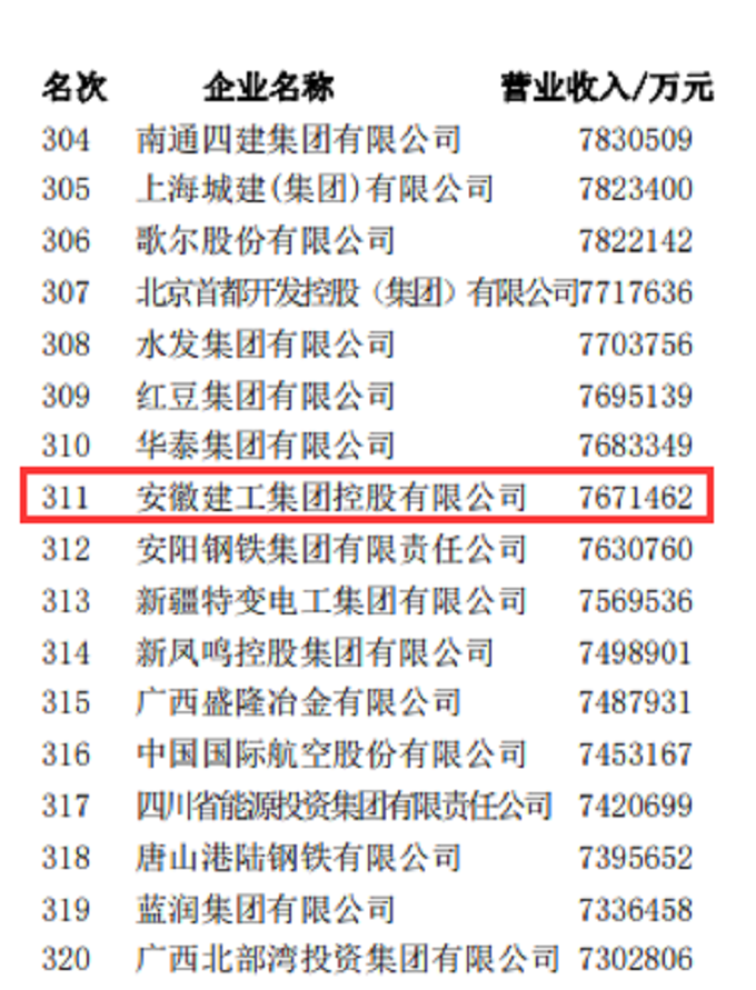2022年9月6日,中國企業(yè)聯(lián)合會、中國企業(yè)家協(xié)會在京舉辦新聞發(fā)布會,發(fā)布了“2022中國企業(yè)500強”榜單。安徽建工集團以767.15億元的營業(yè)收入位列榜單第311位,連續(xù)14年榮登中國企業(yè)500強,較2021年的327位提升16位,保持總體平穩(wěn)、穩(wěn)中有進的發(fā)展態(tài)勢,品牌影響力和價值有效提升。
