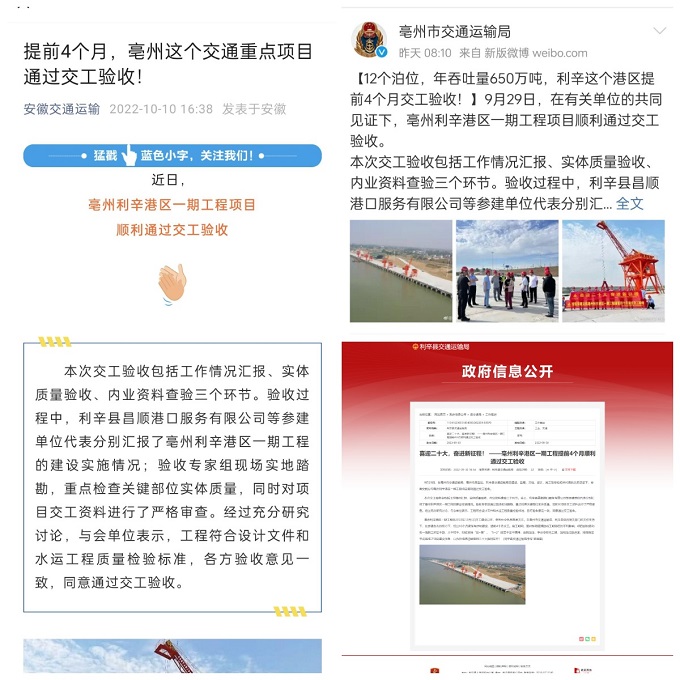近日,安徽省交通運(yùn)輸廳、亳州市交通運(yùn)輸局、利辛縣交通運(yùn)輸局相繼報(bào)道了安徽交航公司亳州利辛港區(qū)一期工程項(xiàng)目提前4個(gè)月交工驗(yàn)收的喜訊。