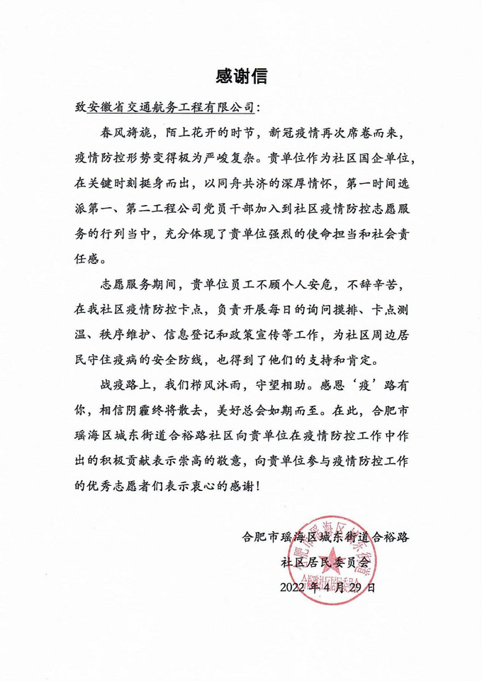 “第一時(shí)間選派第一、第二工程公司黨員干部加入到社區(qū)疫情防控志愿服務(wù)的行列當(dāng)中,充分體現(xiàn)了貴單位強(qiáng)烈的使命擔(dān)當(dāng)和社會(huì)責(zé)任感。”4月29日,公司收到了一封來(lái)自合肥市瑤海區(qū)城東街道合裕路社區(qū)的感謝信,信中對(duì)公司積極參與社區(qū)疫情防控工作表示由衷感謝。