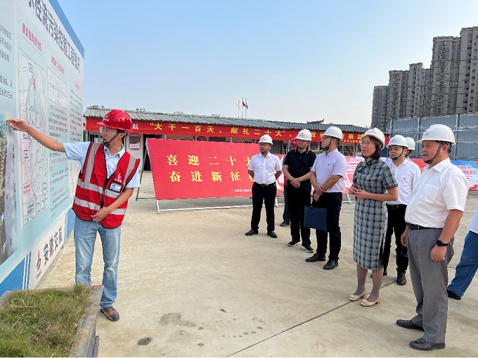 丁金穎一行在項目施工現(xiàn)場實地查看了項目建設情況,認真聽取了關于工程概況、施工進度及安全生產工作情況的匯報,并現(xiàn)場就工程安全、質量等方面提供指導意見。