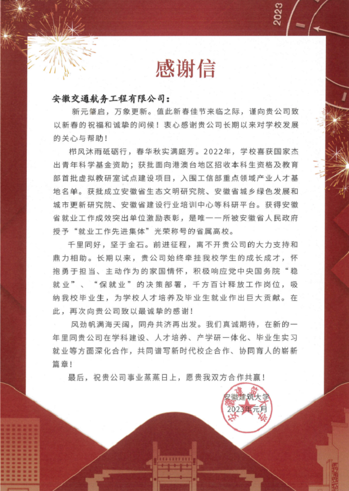 1月19日,安徽交航公司收到安徽建筑大學(xué)發(fā)來的感謝信。信中表示,安徽交航公司長期以來吸納安徽建筑大學(xué)畢業(yè)生,為學(xué)校人才培養(yǎng)及畢業(yè)生就業(yè)作出巨大貢獻,特向我公司表示感謝。