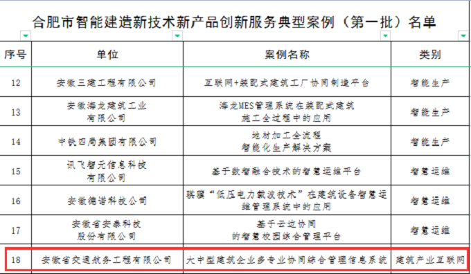 近日,合肥市城鄉(xiāng)建設(shè)局發(fā)布了合肥市智能建造新技術(shù)新產(chǎn)品創(chuàng)新服務(wù)典型案例(第一批),以建工交航綜合管理信息系統(tǒng)為基礎(chǔ)形成的案例“大中型建筑企業(yè)多專業(yè)協(xié)同綜合管理信息系統(tǒng)”作為唯一一個建筑產(chǎn)業(yè)互聯(lián)網(wǎng)類別入選。