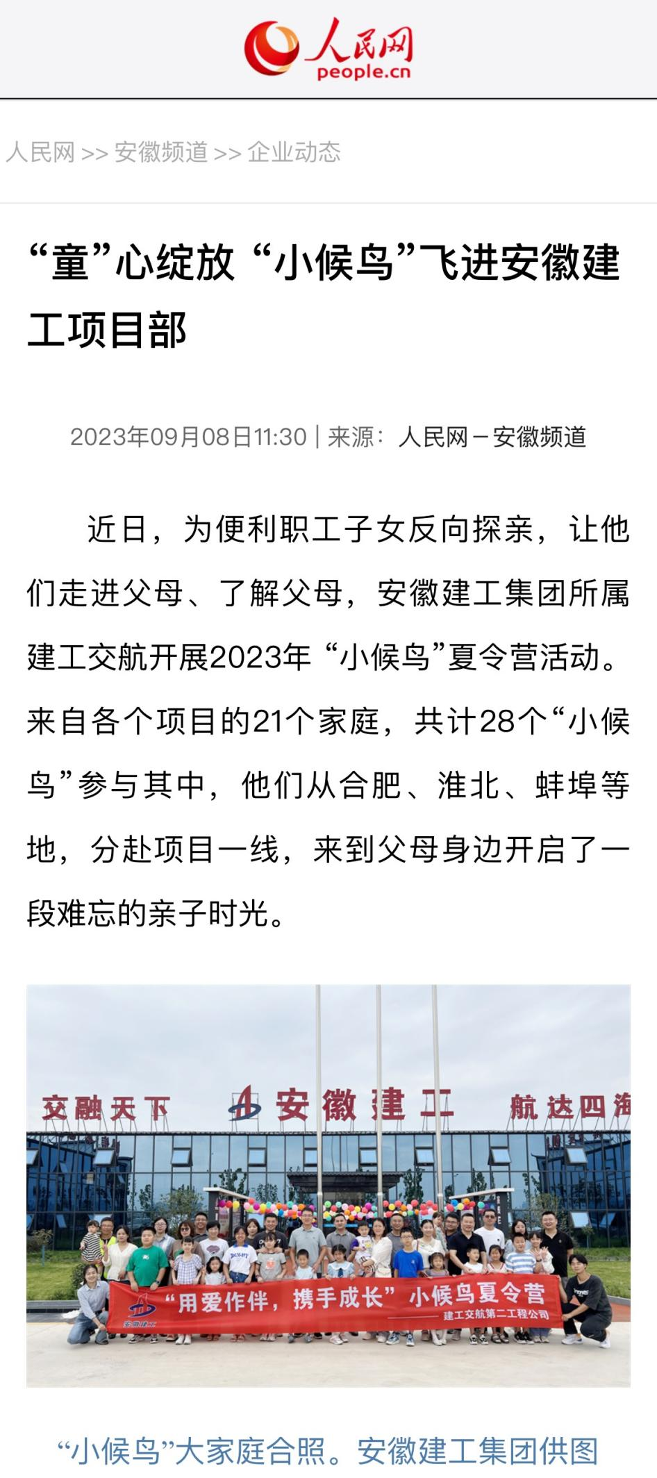 人民網(wǎng)安徽頻道以《“童”心綻放“小候鳥”飛進(jìn)安徽建工項目部》為題,報道建工交航“小候鳥”夏令營活動。
