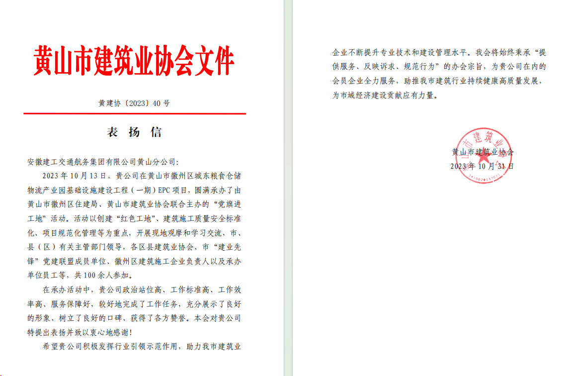 10月31日,建工交航黃山分公司收到黃山市建筑業(yè)協(xié)會發(fā)來的表揚(yáng)信。信中對黃山分公司在所屬徽州區(qū)城東糧食倉儲物流園項目圓滿承辦“黨旗進(jìn)工地”活動予以充分肯定。