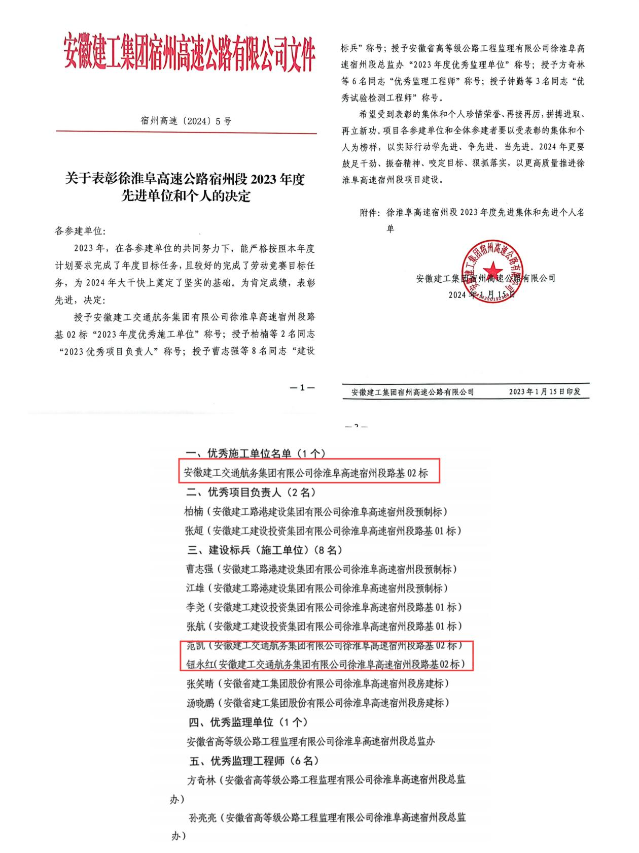 近期,安徽建工集團(tuán)宿州高速公路有限公司召開了2023年度總結(jié)暨2024年工作部署會,表彰2023年徐淮阜高速公路宿州段先進(jìn)單位和先進(jìn)個(gè)人。建工交航徐淮阜高速宿州段路基工程02標(biāo)項(xiàng)目表現(xiàn)優(yōu)異,各項(xiàng)工作推進(jìn)有力,產(chǎn)值進(jìn)度超前完成,在年度綜合評比中取得第一名,榮獲了“2023年度優(yōu)秀施工單位”“2023年度勞動競賽第一名”和2名“建設(shè)標(biāo)兵”榮譽(yù)稱號。