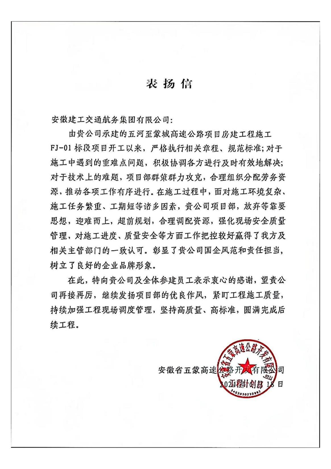 日前,公司承建的五河至蒙城高速公路項(xiàng)目收到業(yè)主安徽省五蒙高速公路開發(fā)有限公司表揚(yáng)信,對五河至蒙城高速公路項(xiàng)目房建工程施工FJ-01標(biāo)項(xiàng)目部全體參建人員為推進(jìn)項(xiàng)目建設(shè)作出的突出貢獻(xiàn)表示衷心感謝。