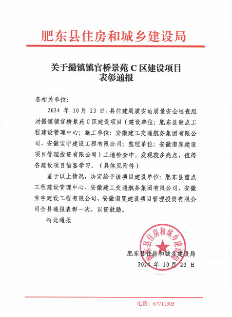 近日,公司在建撮鎮(zhèn)鎮(zhèn)官橋景苑拆遷恢復(fù)樓C區(qū)建設(shè)項(xiàng)目喜獲肥東縣住房和城鄉(xiāng)建設(shè)局全縣通報(bào)表彰。
