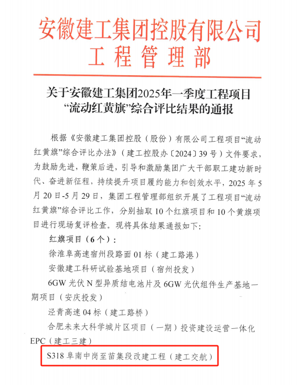 近日,安徽建工集團公布2025年一季度工程項目“流動紅黃旗"評比結(jié)果,建工交航市政工程公司(王家壩建投)承建的S318阜南中崗至苗集段改建工程獲評“紅旗項目”。