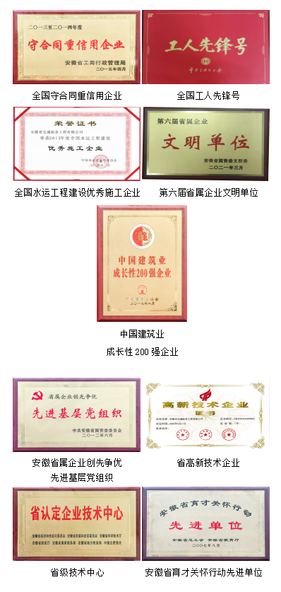 安徽省交通航務(wù)工程有限公司是安徽建工集團(tuán)旗下骨干成員企業(yè),系安徽省首家市政特級(jí)資質(zhì)企業(yè),已同集團(tuán)公司整體上市(股票代碼:600502),注冊(cè)資本10億元,擁有建筑裝修裝飾工程、古建筑工程、河湖整治工程、環(huán)保工程、地基基礎(chǔ)工程、電子與智能化工程、橋梁工程、隧道工程8項(xiàng)壹級(jí)專業(yè)承包資質(zhì),以及建筑工程施工、公路工程施工、港口與航道工程施工、機(jī)電工程施工4項(xiàng)壹級(jí)總承包資質(zhì),具備港口與航道工程、公路工程、水利水電工程、礦山工程、鋼結(jié)構(gòu)、地質(zhì)災(zāi)害處理、河湖整治等施工能力。近年來(lái),公司先后獲評(píng)全國(guó)“重合同、守信用”企業(yè)、中國(guó)建筑業(yè)競(jìng)爭(zhēng)性百?gòu)?qiáng)企業(yè)、全國(guó)水運(yùn)優(yōu)秀施工企業(yè)、省高新技術(shù)企業(yè)、第六屆省屬企業(yè)文明單位等殊榮,連續(xù)多年獲評(píng)“全國(guó)工人先鋒號(hào)”,擁有1個(gè)院士科研工作基地、1個(gè)省級(jí)企業(yè)技術(shù)中心、1個(gè)省級(jí)科技研發(fā)中心,近2年累計(jì)發(fā)明專利10項(xiàng)、省部級(jí)工法15項(xiàng)、實(shí)用新型專利20項(xiàng)。